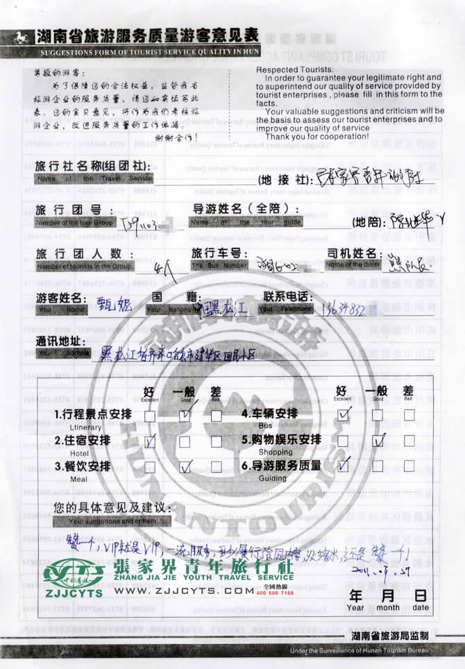 黑龍江齊齊哈爾市“甄女士”與張家界青旅旅游顧問——“田小美”在3月20日取得聯(lián)系,經(jīng)過2次的商談,雙方達成協(xié)議并簽訂了《國內(nèi)旅游組團標準合同》,于3月23日晚上抵達張家界,之后便開始了美麗的張家界之旅。