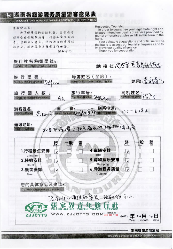 北京海淀區(qū)“范先生”與張家界青旅旅游顧問——曹娟在3月22日取得聯(lián)系,經(jīng)過3次的商談,雙方達(dá)成協(xié)議并簽訂了《國(guó)內(nèi)旅游組團(tuán)標(biāo)準(zhǔn)合同》,范先生一行4人于4月2日下午抵達(dá)長(zhǎng)沙,之后便開始為期4天行程的走進(jìn)湖南,走進(jìn)湘西之旅。 此次行程是由我們優(yōu)秀導(dǎo)游——李彩萍,負(fù)責(zé)旅游接待工作,李導(dǎo)在旅游過程中講解詳細(xì),服務(wù)周到,客人玩的很開心、很滿意。
