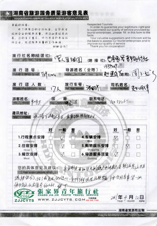 | 浙江寧波市“朱先生”與張家界青旅旅游顧問——“趙艷芳”在3月25日取得聯(lián)系,經(jīng)過2次的商談,后又與我社主要負(fù)責(zé)人“張德建”先生溝通聯(lián)系,最終確立由我社予以配合接待,并雙方達(dá)成協(xié)議后,并簽訂了《國內(nèi)旅游組團(tuán)標(biāo)準(zhǔn)合同》,朱先生一行17人自組團(tuán)于4月8日抵達(dá)長沙,我們安排導(dǎo)游和車輛在長沙黃花機(jī)場迎接貴賓一行下榻,并乘坐我社安排專用接待“高級(jí)考斯特車輛”返回張家界,之后便開始為期4天行程的走進(jìn)湖南,走進(jìn)湘西之旅。