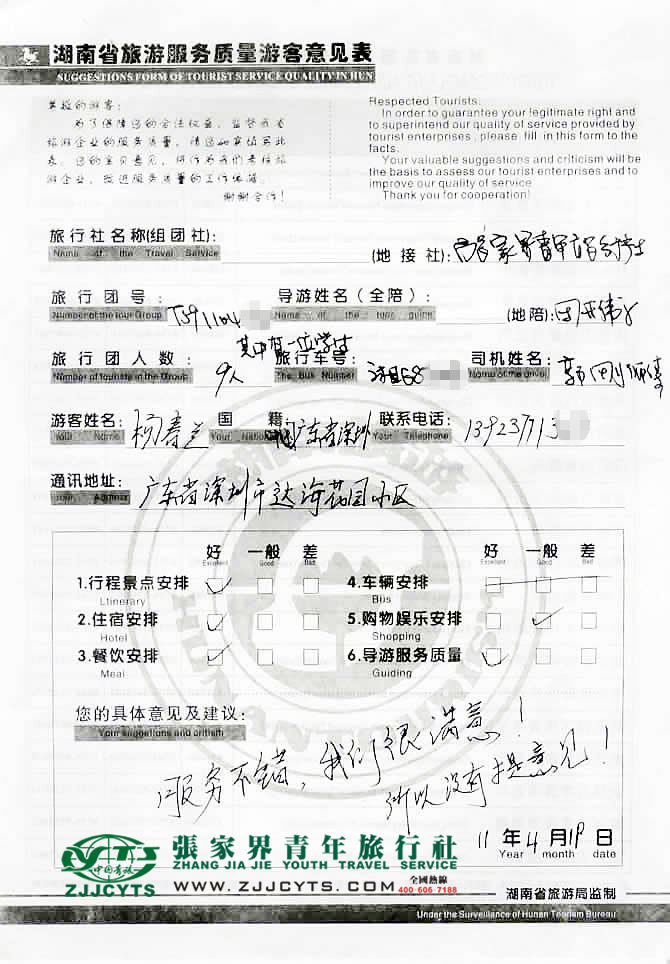 再次感謝楊女士一行9人貴賓,選擇張家界青年旅行社,以及您對張家界青旅的信任與支持。我們會繼續(xù)努力,做好每一個旅游接待工作。期待您和您的朋友再次來到美麗的張家界,祝您工作順利,生活愉快!--客服:“李 霞”留言。2011-04-22