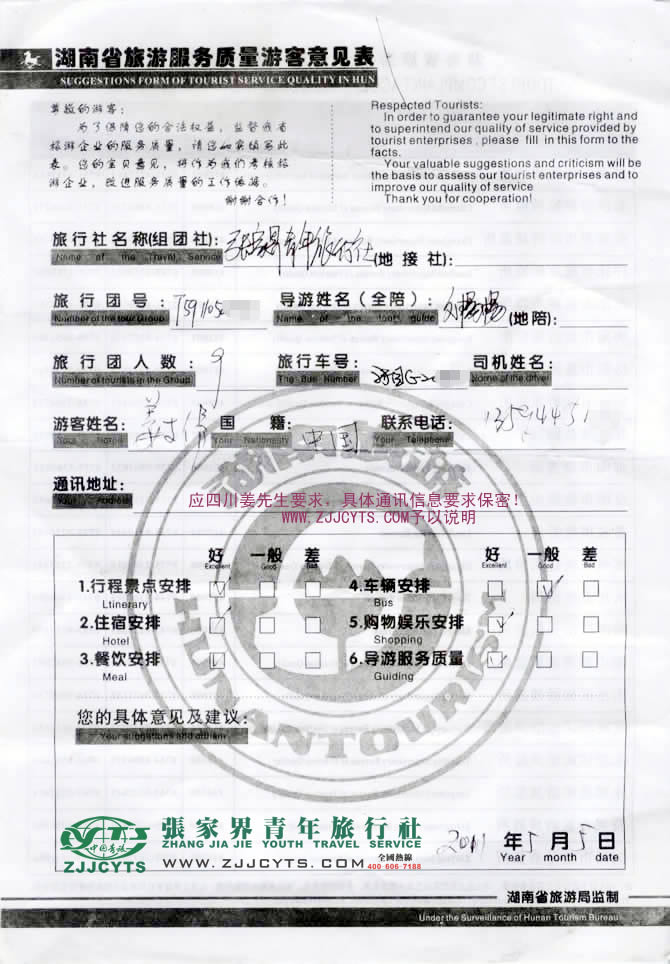 過(guò)程細(xì)節(jié)再現(xiàn) :“北京張小姐在4月23日與青旅客服經(jīng)理“張德建先生”取得聯(lián)系,并通過(guò)多次在線以及電話溝通,最終在4月26日,雙方達(dá)成共識(shí)并簽訂了《國(guó)內(nèi)旅游標(biāo)準(zhǔn)合同》,確立由我方負(fù)責(zé)“北京雅虎公司”貴賓一行9人的接待任務(wù),其中有8人張小姐原籍地四川家人一行于4月29日,自駕車(chē)經(jīng)自四川啟程,經(jīng)貴州、常德、澧縣、武陵源等地,晚10點(diǎn)許抵達(dá)張家界市,張小姐1人乘自【北京-張家界】直航飛機(jī)于同日晚也抵達(dá)張家界市,次日之后便開(kāi)始了3天行程的走進(jìn)美麗的張家界純玩之旅。
