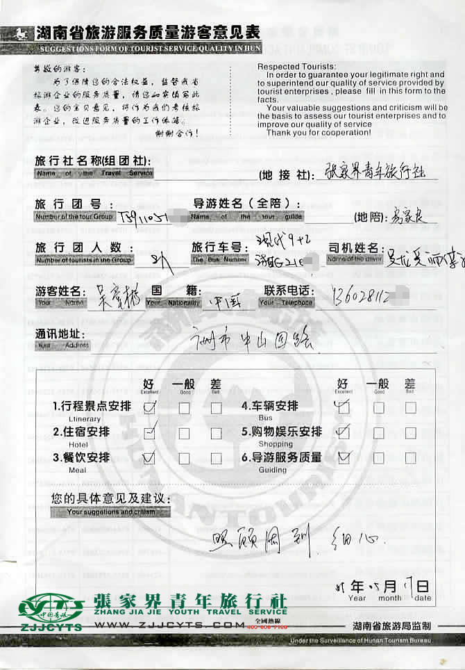 廣東廣州市“吳先生”與張家界青旅旅游顧問——客服“谷盈”在5月03日取得聯(lián)系,并與吳先生、廖小姐一行8人(其中有滿60歲老人一名;1.2米幼童一名),就同行人員基本情況,做了深層次的在線溝通,并最后在5月09日確立《國內旅游組團接待合同》,由我社負責接待安排,并與之簽訂了接待服務協(xié)議;吳先生8人一行(含全陪1人)于5月13日上午09:15點許抵達張家界市,之后便開始了3天行程的走進的美麗張家界之旅。 5月17日下午結束行程后火車返程