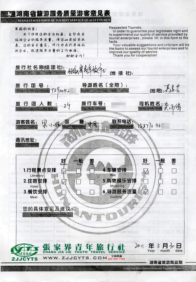 廣西柳州市“梁女士”與張家界青旅旅游顧問(wèn)——客服“田秋萍”在5月12日取得聯(lián)系,并與廣西柳州梁小姐以及其丈夫paul先生(英國(guó)籍貫),就旅游行程和服務(wù)標(biāo)準(zhǔn)等問(wèn)題、還有返程火車(chē)票代訂問(wèn)題,做了深層次的在線(xiàn)溝通,此后經(jīng)過(guò)細(xì)致的商磋,最終在5月21日才確立《國(guó)內(nèi)旅游組團(tuán)接待合同》,并委托我社預(yù)訂往返返程火車(chē)票。并且確立由我社負(fù)責(zé)全程接待安排;梁女士一行2人于5月28日乘坐K1474次自柳州出發(fā),次日上午九時(shí)許抵達(dá)張家界市,我社安排導(dǎo)游“聶素珍”鮮花迎接。之后便開(kāi)始了3天行程的走進(jìn)的美麗張家界之旅。 5月30日下午16:00許結(jié)束行程,由我司車(chē)輛送往張家界火車(chē)站。2位貴賓搭乘K1473次返程。