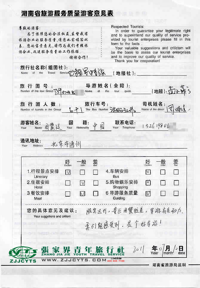 | 在此感謝北京周總親率團隊一行7位貴賓,給予張家界中青旅為您一行服務的機會,同時也感謝貴賓一行對我社行程安排及導游服務給予的高度評價,以及對服務過程中給予的配合與支持,也感謝您在用餐方面不周給予的諒解。歡迎您和您的家人、朋友再次蒞臨美麗的湘西做客觀光。再次感謝。--客服“王國華”留言。 |