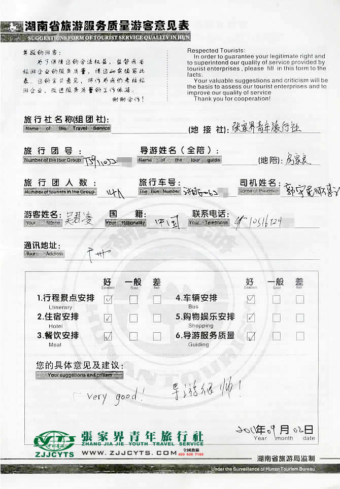 廣東廣州市“吳小姐”與張家界青旅旅游顧問——客服經(jīng)理“李朝陽(yáng)”在08月22日取得聯(lián)系,并就線路、行程的合理選擇、旅游景點(diǎn)的選定,以及服務(wù)的具體要求、范圍與廣州晶爾曼首飾有限公司負(fù)責(zé)人吳女士,做了多次在線溝通和電話溝通,經(jīng)過(guò)仔細(xì)的商磋,最終在08月24日雙方簽訂了《國(guó)內(nèi)旅游組團(tuán)接待合同》,并正式確立由我社負(fù)責(zé)全程接待安排;吳總一行14人,于08月25上午自廣州搭乘CZ3385次航班飛抵張家界,當(dāng)日便開始了為期4天行程的魅力湘西之旅。