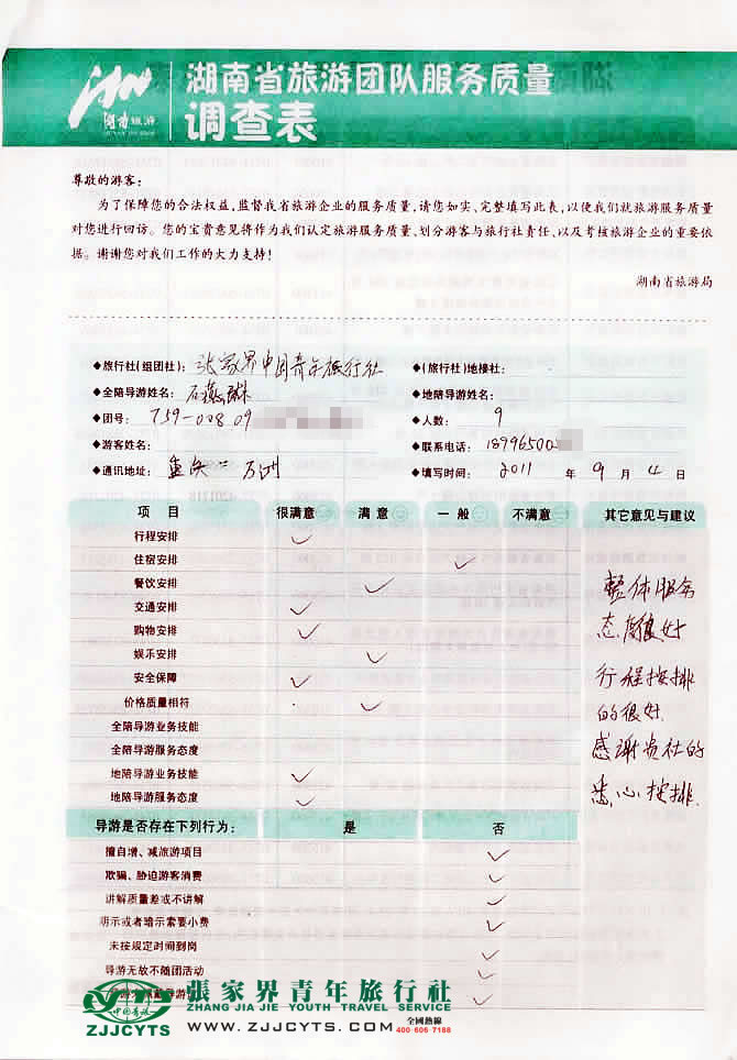 重慶萬(wàn)州“高先生”與張家界青旅旅游顧問(wèn)——客服“谷盈”在08月26日取得聯(lián)系,并就線(xiàn)路、行程的合理選擇、旅游景點(diǎn)的選定,以及服務(wù)的具體要求、范圍與負(fù)責(zé)此次旅游活動(dòng)負(fù)責(zé)人高先生,做了多次在線(xiàn)溝通和電話(huà)溝通,最終在08月29日雙方簽訂了《國(guó)內(nèi)旅游組團(tuán)接待合同》,并正式確立由我社負(fù)責(zé)全程接待安排;高先生一行9人,于08月31下午從萬(wàn)州搭乘K1098次火車(chē),于第二天09月01日上午06:40許抵達(dá)張家界,當(dāng)天我社安排導(dǎo)游和司機(jī)迎接站,當(dāng)日便開(kāi)始了為期4天行程的湘西經(jīng)典之旅,09月04日中午午餐后返程送團(tuán)吉首,貴賓返程。