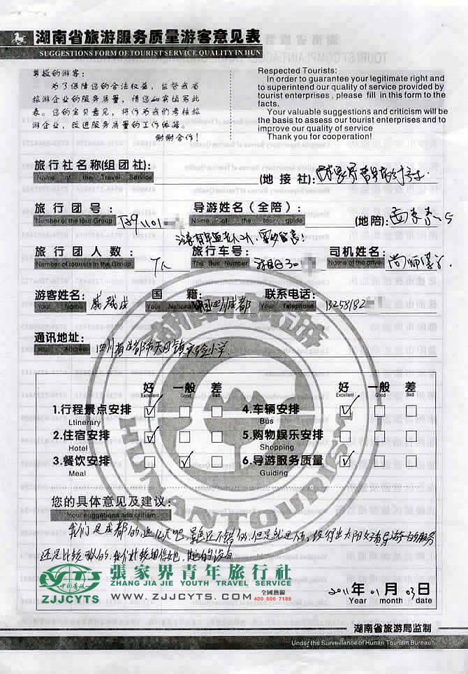 四川成都市“戚先生”與張家界青旅旅游顧問——劉文英在2010年12月20日取得聯(lián)系,經(jīng)過幾次的商談,雙方達成協(xié)議并簽訂了《國內(nèi)旅游組團標準合同》,于2010年12月31日下午抵達張家界,之后便開始了4天行程的湘西之旅。 此次行程是由我們優(yōu)秀導游——孟素素,負責旅游接待工作,孟導在旅游過程中講解詳細,服務周到,客人也很滿意。并給予導游服務較高評價!
