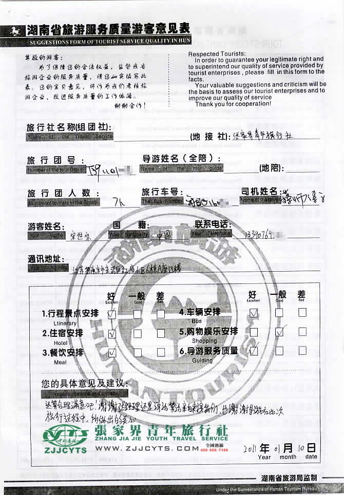 | 江蘇南京市“宋先生”與張家界青旅旅游顧問(wèn)——?jiǎng)⑽挠⒃?1月02日取得聯(lián)系,經(jīng)過(guò)幾次的商談,雙方達(dá)成協(xié)議并簽訂了《國(guó)內(nèi)旅游組團(tuán)標(biāo)準(zhǔn)合同》,于01月06日下午抵達(dá)張家界,之后便開(kāi)始了湘西之旅。